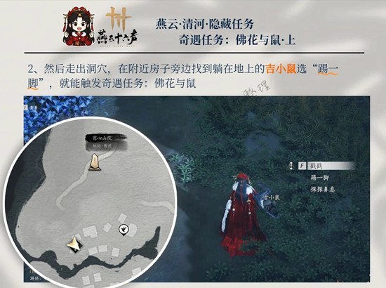 2、然后走出洞穴,在附近房子旁边找到躺在地上的吉小鼠选“踢一脚”,就能触发奇遇任务:佛花与鼠