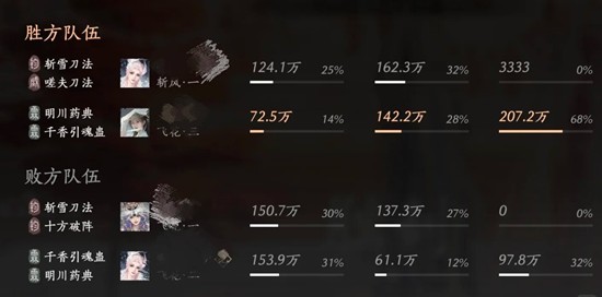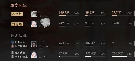 当队友和我的血量恢复了,我们就选择打血量不健康的霖霖,那个钧钧太会跑又能输出了。还好对面霖霖那会儿奶圈cd中,我抓紧机会就先把霖霖杀掉了。我整一场处决只拿到了两三个,精元很有限,所以每一次放出奇术都要想好对面可能的动作,看了下结算对面伤害打了快叁百万,很厉害,所以随机应变真的很重要。