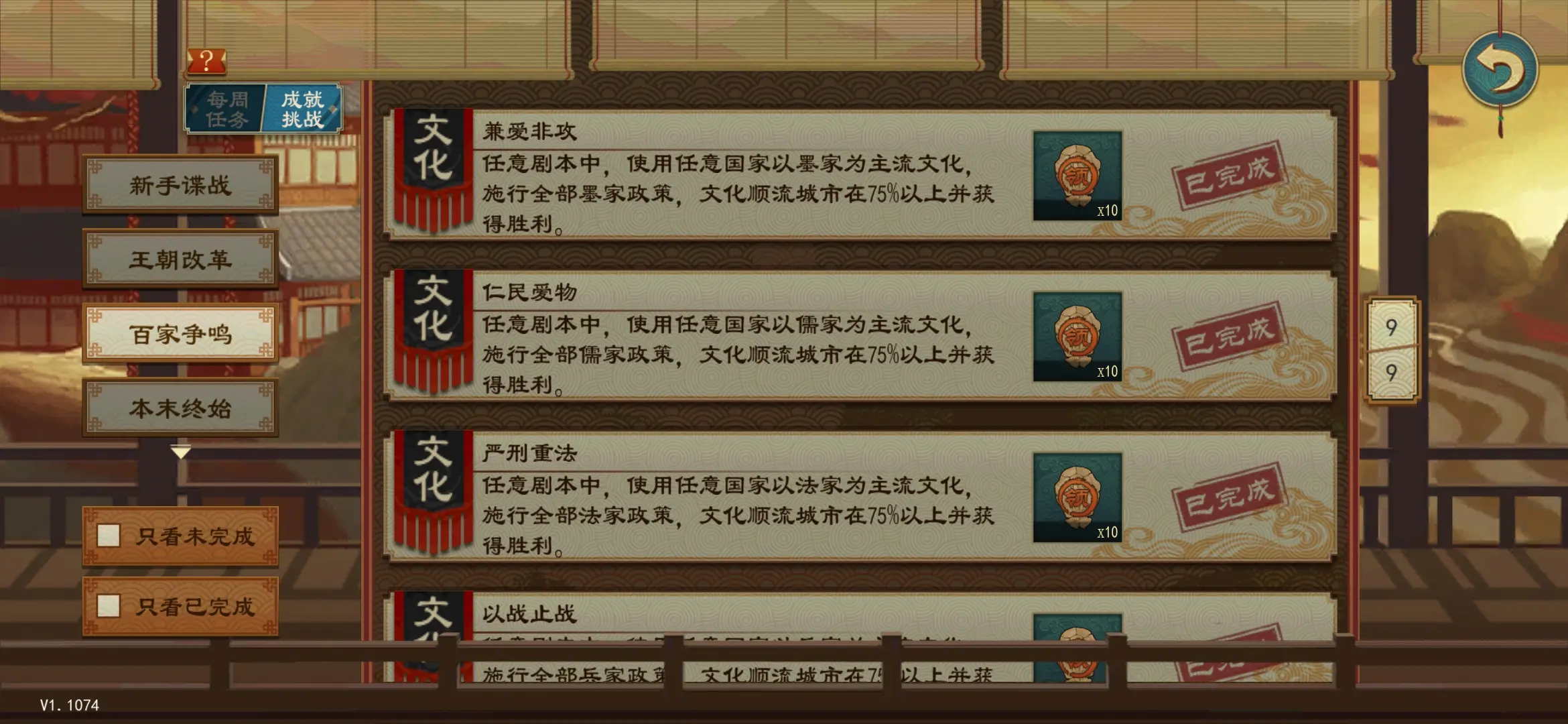 大周列国志百家争鸣成就完成方式大全,一共9个成就一样的模式。要求写的很明确,派系政策点完,主流文化大于75%,后者可以在学府里查看顺逆城市的比例