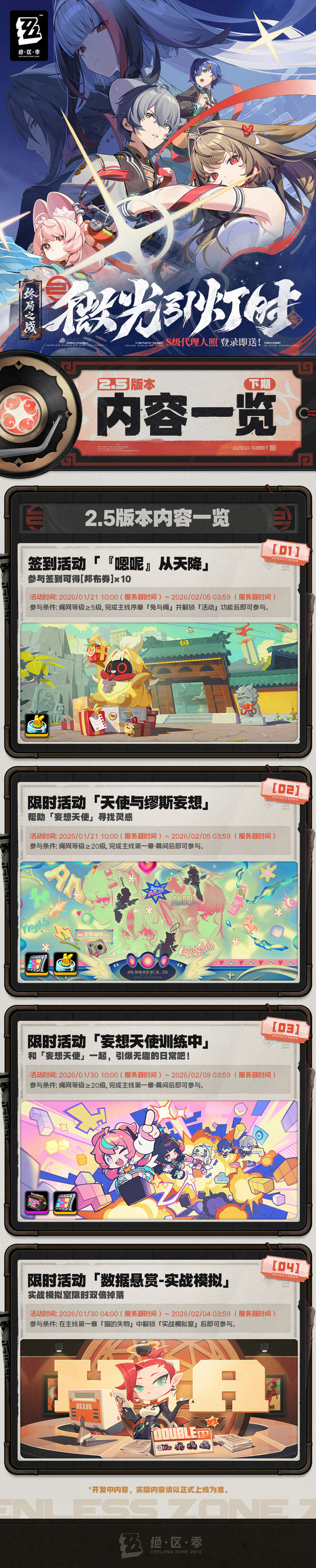 绝区零微光引灯时2.5版本内容一览,绳匠们好,2.5版本「独家重映」&「音擎回响」频段现已开启。更有签到活动「『嗯呢』从天降」、限时活动「天使与缪斯妄想」、限时活动「妄想天使训练中」等精彩内容更新,一起来看看吧!