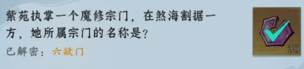 问剑长生神念禁制关于紫苑的题目解密答案分别是白色头发、宗门名称六欲门、它是一个镜子、无法理解的情感是大爱、父亲的名字是紫宸真人。