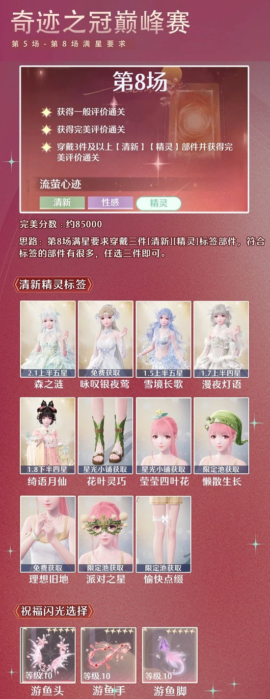 > 第8场满星要求穿戴三件[清新][精灵]标签部件,符合标签的部件有很多,任选三件即可。