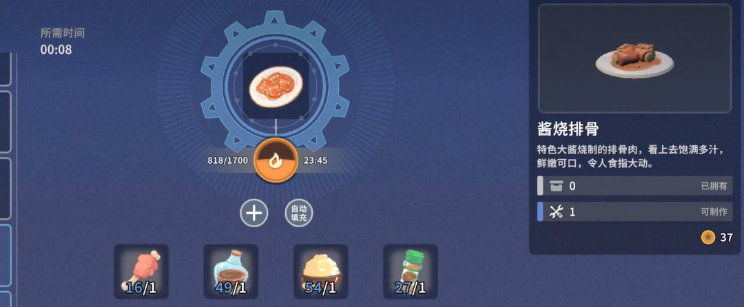 基础食谱中,“蜜汁油果”由蚁蜜与爆浆油果组成,操作门槛低、制作耗时短,适合体力临界状态下的快速补充。“排骨焖饭”则需排骨、米和爆浆油果三者协同,虽步骤略增,但体力回复量显著提升,尤其适用于矿洞深层挖掘或大型工坊订单交付前的预热准备。
