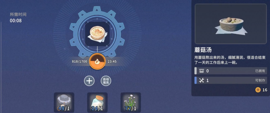 启用烹饪功能的前提是建造并放置“烹饪台”。该设施解锁后,玩家可将任意两种及以上食材投入其中进行自由组合。成功合成一道料理后,对应配方即被永久记录,后续制作无需重复试配。食材来源涵盖三大类:农田耕种(如哈密瓜、沙漠蘑菇)、野外采集(如沙棘、仙人掌、苁蓉)以及畜牧产出(如蛋、排骨)。不同获取方式影响食材稳定性和稀有度,建议玩家提前规划资源布局。