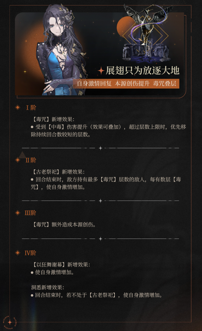 另外,笃笃骨的激 情回转能力获得了大幅提升。处于大招吟诵状态下,根据敌方持有最多毒咒层数的敌人额外获取激 情,不处于吟诵状态或者吟诵状态结束时,也能获得激 情。