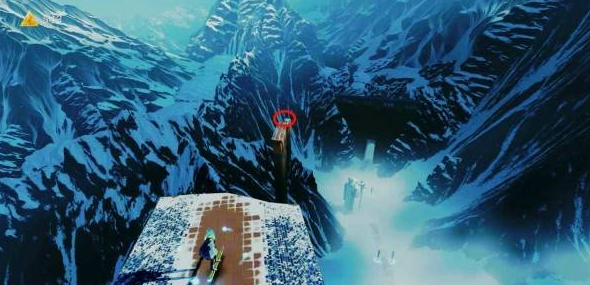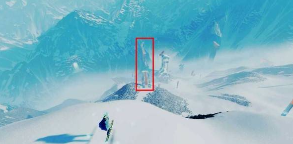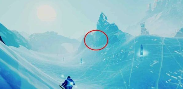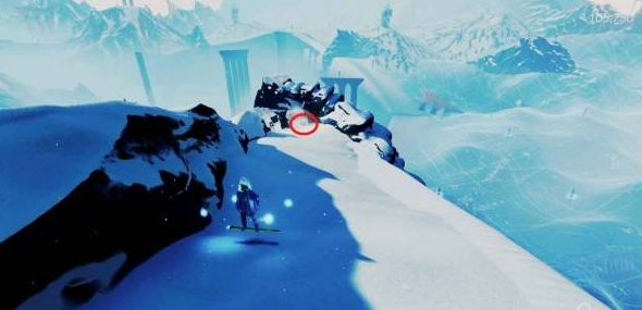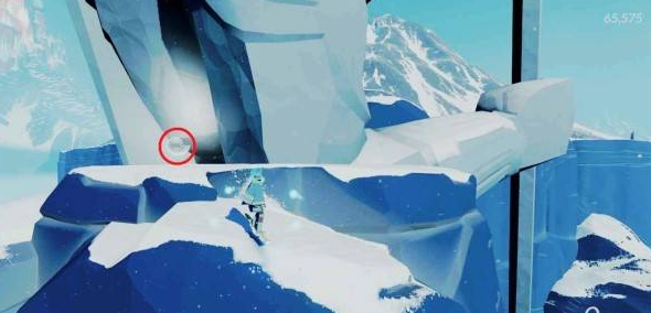 在同一个位置往回看拱形石头,从左侧雪坡加速跳到拱形石头顶部即可看到贝壳。