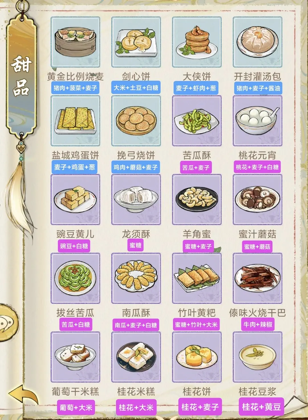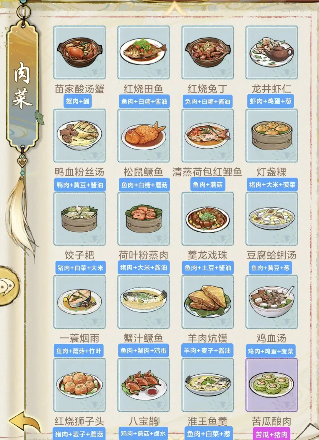 华夏千秋菜谱分为肉菜、素菜、甜品、酒四大种类,每一个菜品都需要使用相对应的食物材料来进行合成制作,下面为大家整理收集了详细的游戏中各个菜品的详情制作配方内容!