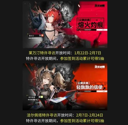 限定角色卡池采用分阶段投放策略:第一期「莱万汀·熔火灼痕」开放时间为1月22日至2月7日;第二期「吉尔佩塔·轻飘飘信使」为2月7日至2月24日;第三期「伊冯·热烈色彩」则自2月24日起持续至当前版本更新结束。每期活动期间,每日签到即可领取对应奖励,单期最高可获5次寻访机会,三期合计共15抽,助力玩家稳定获取限定干员。