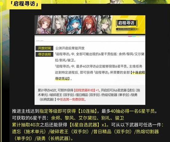 新手友好型卡池机制全面落地。常驻开启的「启程寻访」池中,保底机制明确:累计抽取40次必得六星干员,如艾尔黛拉、余烬等核心角色均纳入该池。随着主线推进至指定等级,还将陆续解锁超10张启程寻访凭证,全程无需额外付费即可完成关键角色抽取。达成40抽累计目标后,还可领取自选六星武器及“破碎君王双手剑”等高阶装备,大幅缩短开荒周期。值得注意的是,该常驻池后续亦会轮替加入同款六星干员,保障长期可获取性。