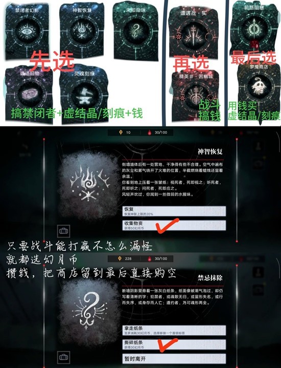 先开奖励石碑拿虚结晶/补充禁闭者/拿钱→再战斗拿钱→最后去买空梦魇商店合成刻痕