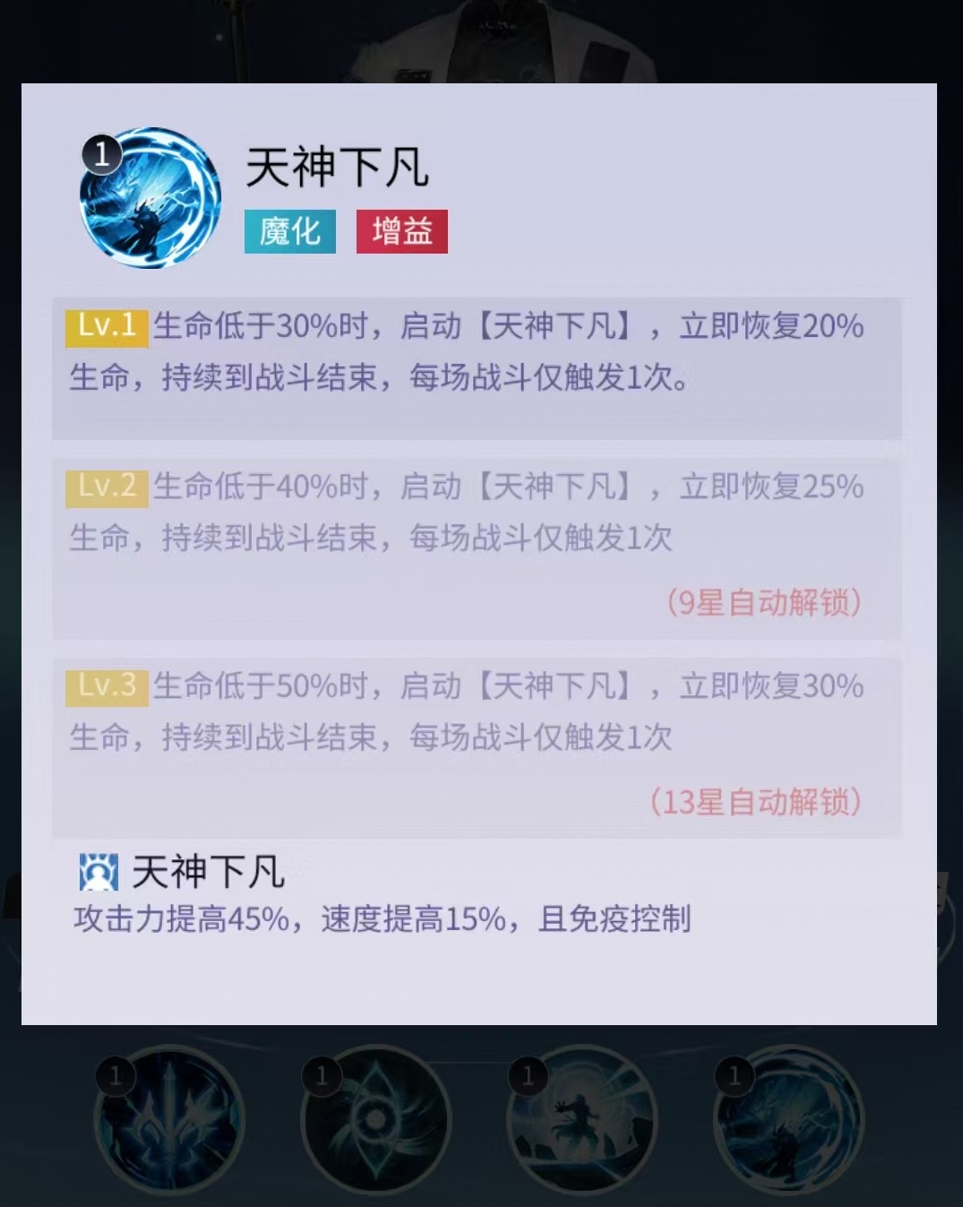 二技能具备双重增益逻辑:一方面随普攻次数累积提升伤害系数;另一方面在敌方释放控制类技能的瞬间自动触发追击响应。该技能同步强化角色三项核心属性——攻击力、最大生命值与暴击率,形成攻守兼备的成长路径。大招“天神下凡”为保命与反杀核心机制:当杨戬生命值降至30%以下时强制激活,立即恢复大量生命,并进入持续性天神状态。此状态下,角色获得攻击力与行动速度的显著提升,同时完全免疫所有控制效果。该特性使其在高压控场环境中具备极强的生存韧性与反打能力,适合作为主力输出位应对多控阵容。