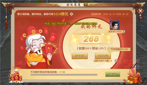 2月1日至3月3日,开年福利活动「财运滚滚来」火热开启。海量绑元拿不停,更可领取喜庆又俏皮的发型【财多多】——让你从年初到年尾,做江湖中最受眷顾的好运之星~