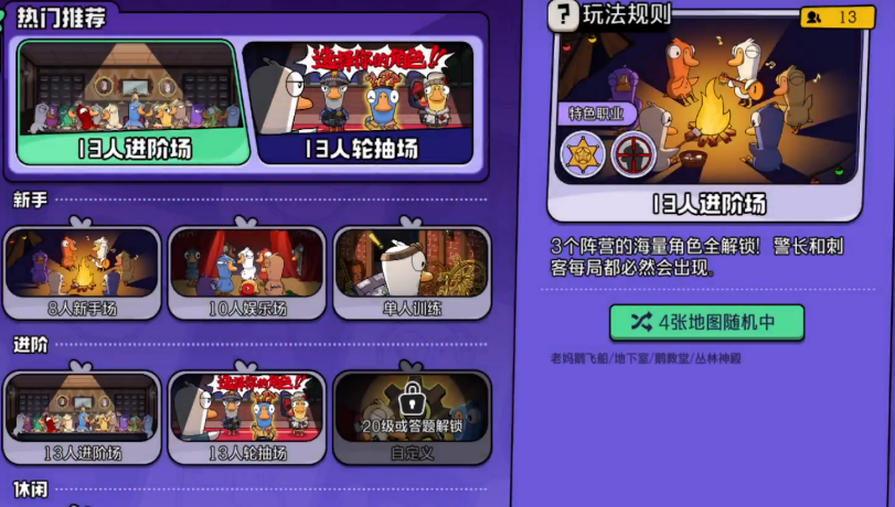 除基础8人局外,13人轮抽模式提供更高自由度:每名玩家开局将获得三个随机身份选项,可自主选取其一。该机制鼓励玩家发挥擅长角色的优势,提升战术主动性,同时也显著增强局势复杂度。而13人进阶模式则回归系统统一分配机制,不开放选择权,全凭随机匹配,对玩家的身份适应力、临场反应与团队协同提出更高要求,更适合经验丰富的参与者挑战。