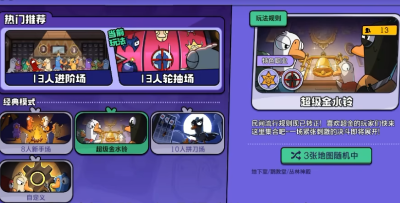 娱乐向模式进一步拓展玩法维度。超级金水铃模式沿用原有胜负判定逻辑,但赋予鹅阵营一次特殊权限——发起“超级会议”,在该会议中可指定任意一名玩家进行一对一挑战:若对方为鸭或中立阵营,则直接淘汰;若误选同为鹅阵营成员,则发起者自身立即出局。侦探猎场模式则引入技能随机机制,每位玩家在开局获得唯一被动或主动技能,且可自主决定是否承担“凶手”身份,此举大幅增加信息迷雾层级,强化心理博弈深度。