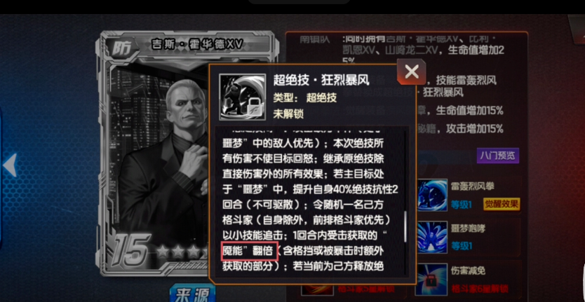 另一超绝技【狂烈暴风】强化反击收益:每次成功反击后,额外获得等量怒气点数(即双倍获取);被其“被刺”技能命中的目标无法恢复怒气值。该技能整合了原绝技除基础伤害外的所有增益效果;若主攻击目标处于“噩梦”状态,则吉斯自身绝技抗性提升40%,持续2回合。