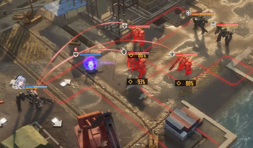首先在不装备专武的前提下,菲娅的天赋折射攻击应该是上边这个状态,例如上图中的这次攻击我就选择的是往斜上方进行折射。