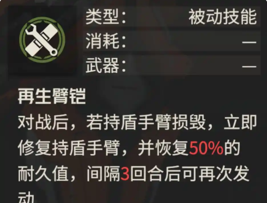 接着我们来说凌波的专武,其第一个效果是可以立刻修复并回复持盾手臂血量,这个效果在防守时或者是用大盾进行【舍身决意】的攻击时会有更好的续航效果。
