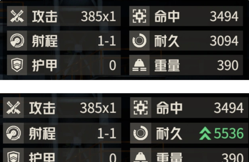 那么此专武的第三个特性为提升盾牌的耐久,但这个提升并非是直接让我们持盾手的耐久范围,因为它只会让盾牌提供的耐久翻倍,就像是下图中所演示的这般,所以下边的第二幅对比图就给大家演示了在不带专武和带了专武后的持盾手血量提升,的确有,但并没有达到很夸张的程度。