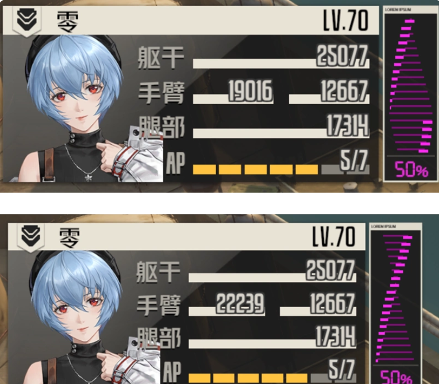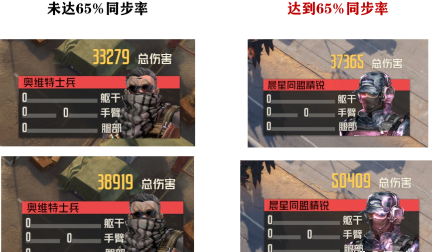 此外对于刚刚所提出的固伤提升问题,我们联系到持盾手血量的提升一起来做个对比测试,下边的左侧的上下两个伤害图分别是带“寒碑”与凌波专武后的【舍身决意】时,在没有达到65%同步率时的伤害,其中带专武的伤害是不带专武的117%左右,而右侧的上下两个伤害图则分别是不带专武和带了专武在达成65%同步率后的伤害对比,其中带专武的伤害是不带专武的35%左右,所以大家对于这个伤害的提升到底满意否呢?也欢迎留言来聊聊你的看法吧。