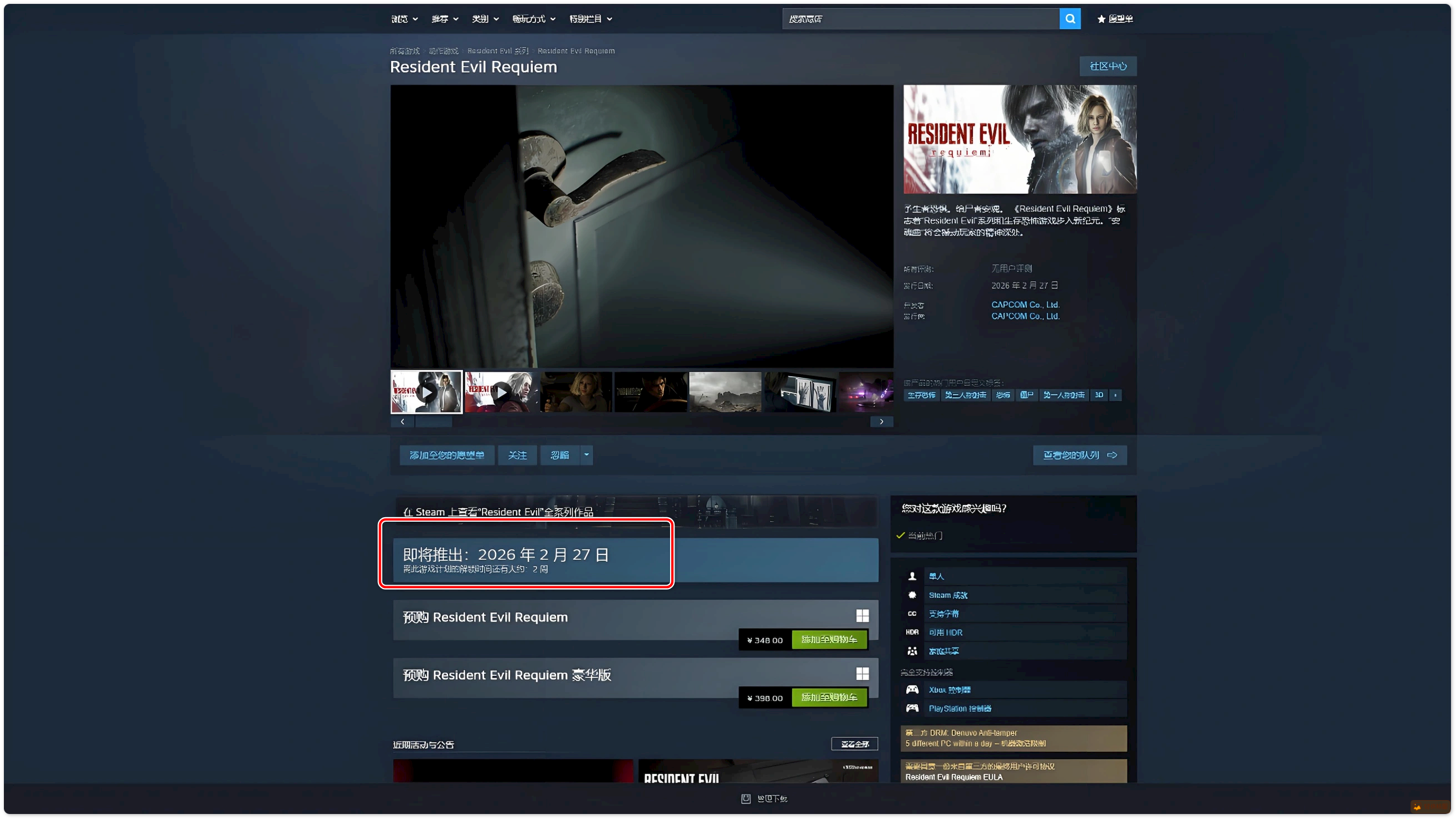 游戏确认将于2月27日全球同步上线,Steam国区标准版定价为348元。尽管为单机作品,但首发阶段仍存在若干技术性门槛:D加密首次在线验证需排队等待,首日补丁体积庞大易造成加载界面卡顿。建议玩家提前48小时完成预载,并在发售当日错峰进行最终下载与验证操作。