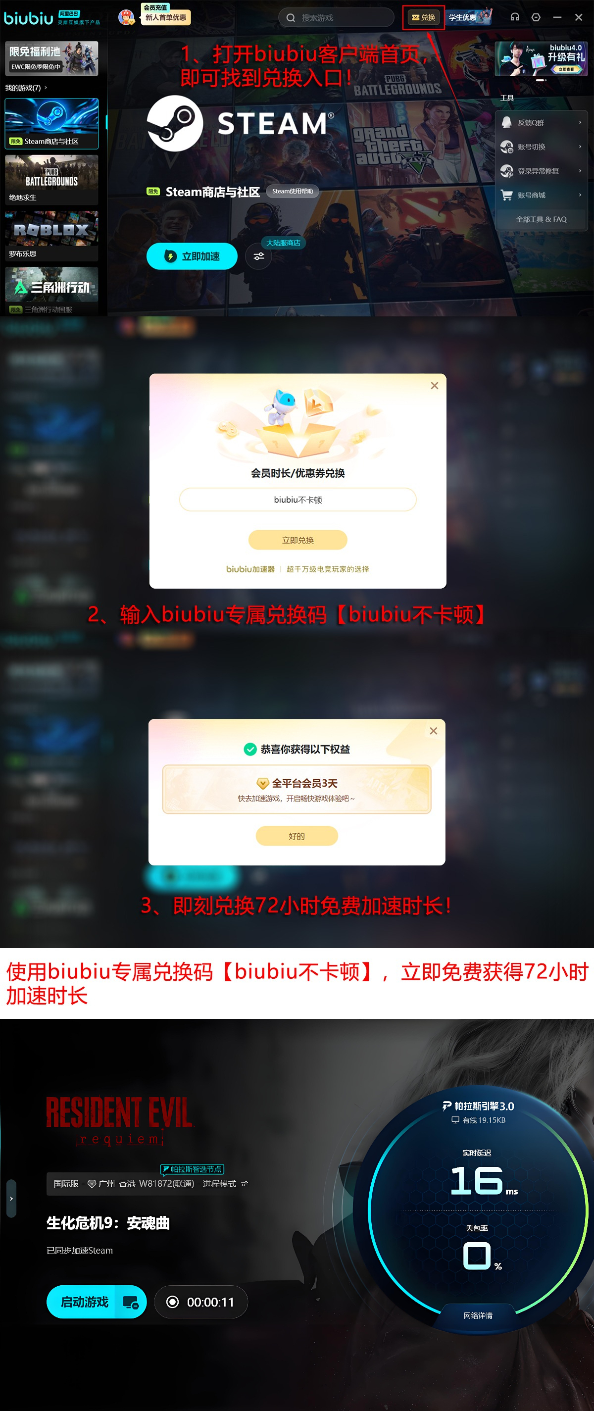 新用户注册biubiu加速I器即可获赠24小时免费加速时长;叠加输入兑换码【biubiu不卡顿】还可额外领取72小时,总计96小时免费权益,足以支撑从发售当日至全流程通关的稳定网络需求。