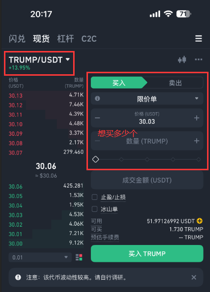 在交易界面搜索TRUMP/USDT交易对,可选择市价即时成交或设置限价单等待理想价位。新手建议使用简洁版交易界面,专业版提供更丰富的图表分析工具。