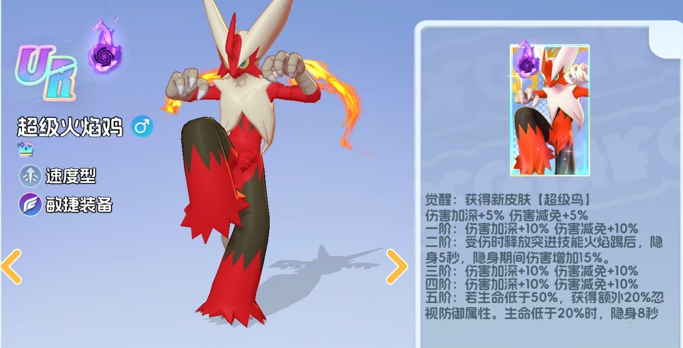 超级火焰鸡完整继承火稚鸡原有四技能体系,并新增专属机制“超加速燃烧”。该机制初始提供5%伤害提升与5%所受伤害降低;当完成全部MEGA进化突破(即升至满阶上限)后,加成幅度提升至35%伤害提升与35%伤害减免。此外,在自身处于受伤状态时释放“火焰踢”,将触发隐身效果,持续5秒;隐身期间,额外获得攻速、暴击率与移速叠加增益,显著强化其切入敌方后排的稳定性与斩杀效率。