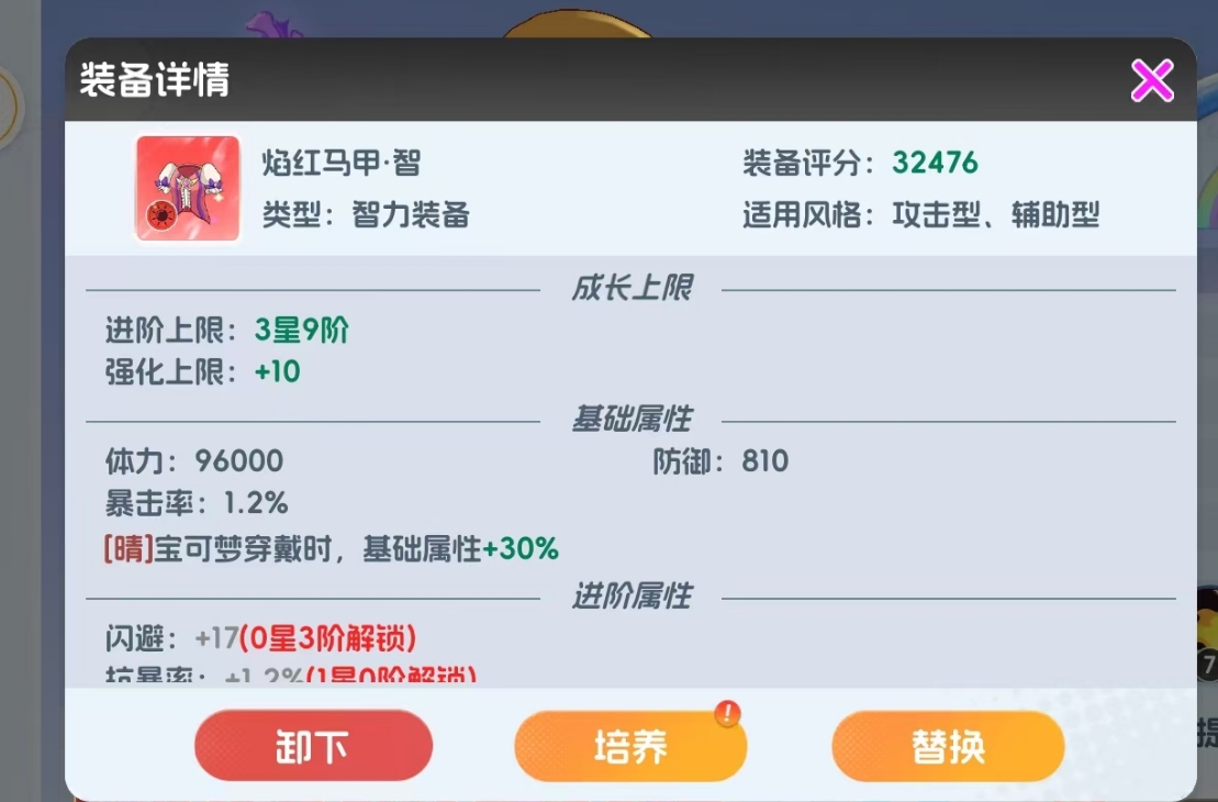 装备配置需紧扣其法术伤害定位。推荐优先选择智力属性主词条装备,并确保套装附带幻阵营或晴阵营加成——因超级喷火龙同时归属幻、晴双阵营,可双重享受阵营属性加成,大幅提升综合战力。武器副词条建议优先洗练吸血、法术伤害加深、忽视异常抗性、暴击率或攻击力加成;若能通过高级洗练石获取小火龙专属特效词条,则将进一步释放其输出潜能。