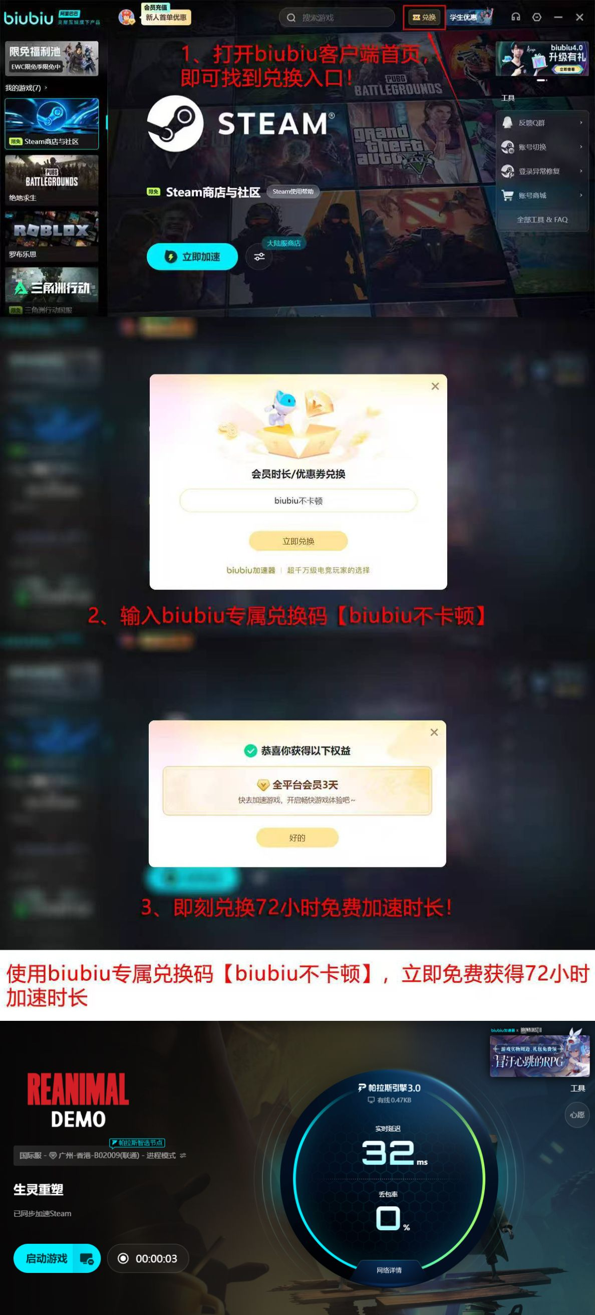 新用户完成首次注册后,系统将自动发放24小时全功能免费加速时长;此外,平台面向所有用户开放通用三日体验权益,只需在指定输入框内填写【biubiu不卡顿】,即可即时领取并启用。