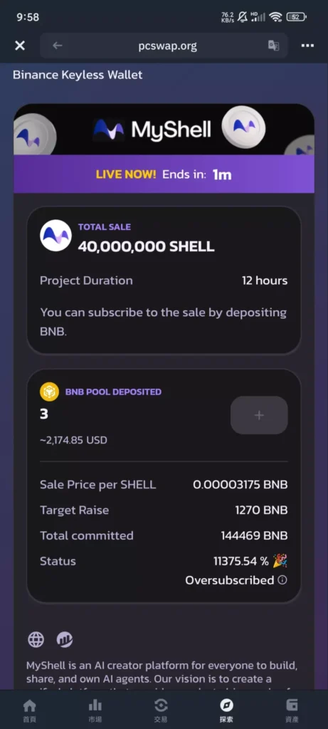 完成KYC后,通过币安钱袋进入IDO页面质押BNB。以SHELL项目为例,单账号可获得826.98枚代币,实现300美元净收益。