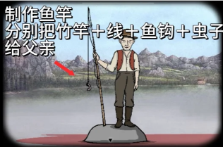 7、制作鱼竿,分别把竹竿+线+鱼钩+虫子给父亲