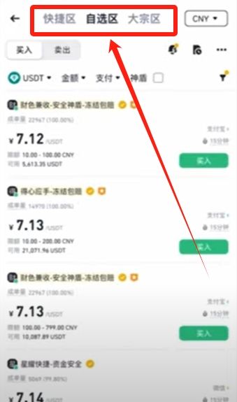 来到交易页面,这里默认让我们进入到了自选区。上方还有快捷区和大宗区。大宗区主要是针对大额的交易,我们一般情况下是用不到的。快捷区是你需要买多少,平台直接给你匹配,不需要你去找。