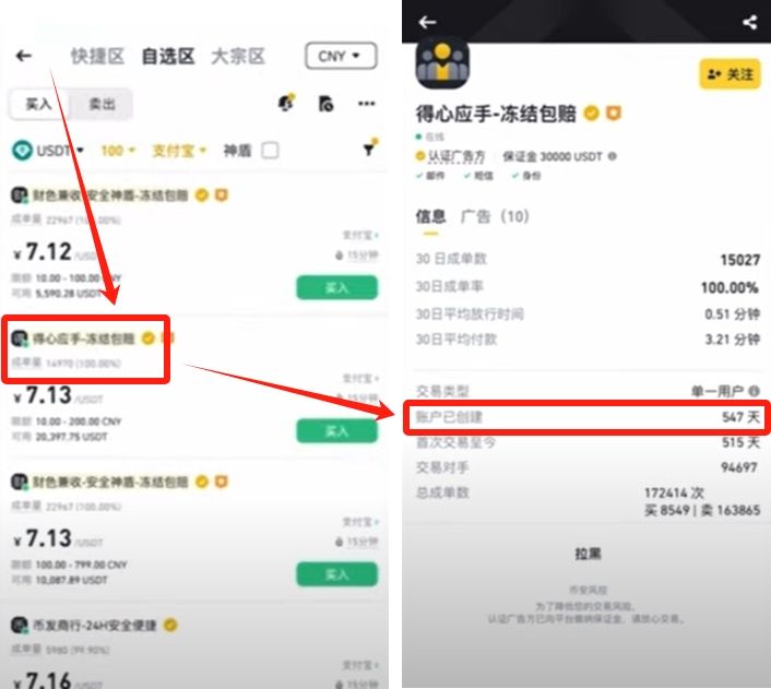这里建议仍旧还是可以选择银彳卡,同时大家也可以像我刚才那样,在C2C交易里面筛选完交易条件之后,点开商家的主页看一看,尽量找那些2024年以前注册的,成单量比较高的商家。注册时间越久、越长,成单量越高的商家就越安全。