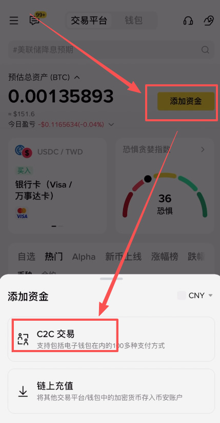 1、进入币安APP(官方注册 官方下载)之后,买币也就是我们俗称的入金。我们点击这里的【添加资金】,选择【C2C交易】。