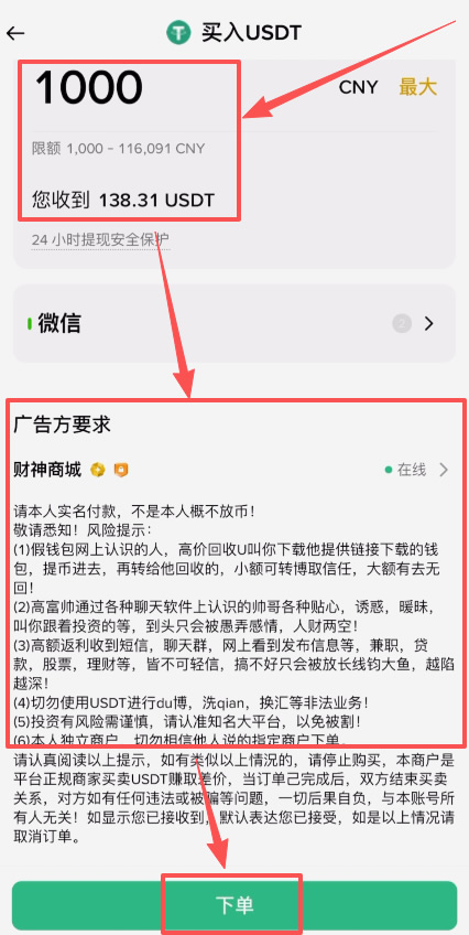 7、这里给我们计算出我能收到138.31个U,下方这里有一个广告方的要求,我们查看一下,想要让交易顺利的进行,我们就必须按照商家的要求去做,比如说我们一定要实名付款。点击【下单】。