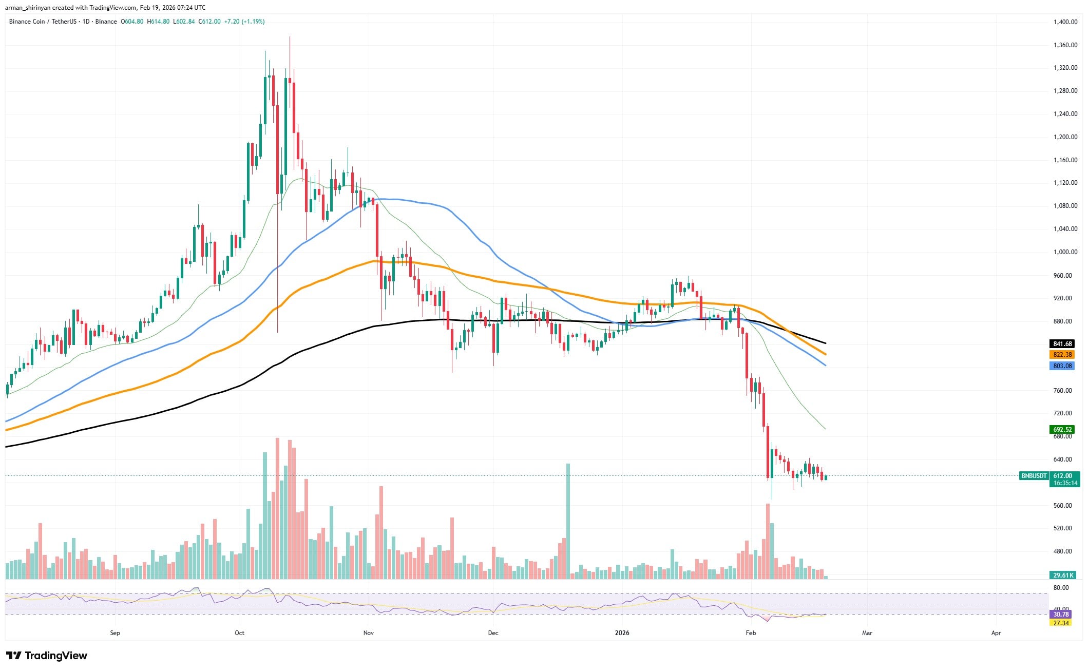 经历月初的暴跌后,BNB在价格方面仍承压。大幅抛售过后,日线图显示其价格仍在610-620美元区间徘徊,均线持续下行。26日均线及更长期均线高悬于现价上方,形成阻力而非支撑。
