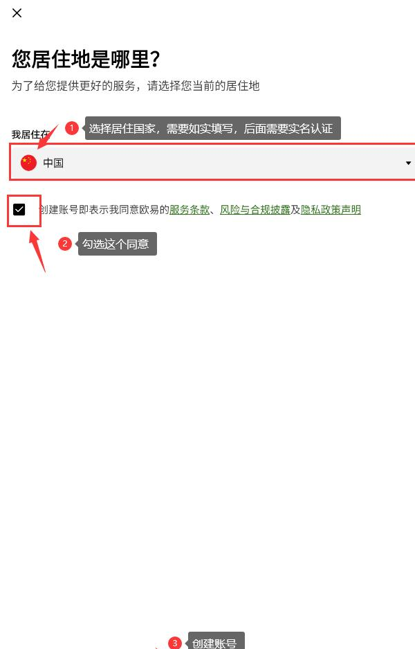 启动应用后点击注册按钮,首先需要选择所在国家地区。特别注意居住地址需与身份件件信息保持一致,这是通过实名认证的关键步骤。