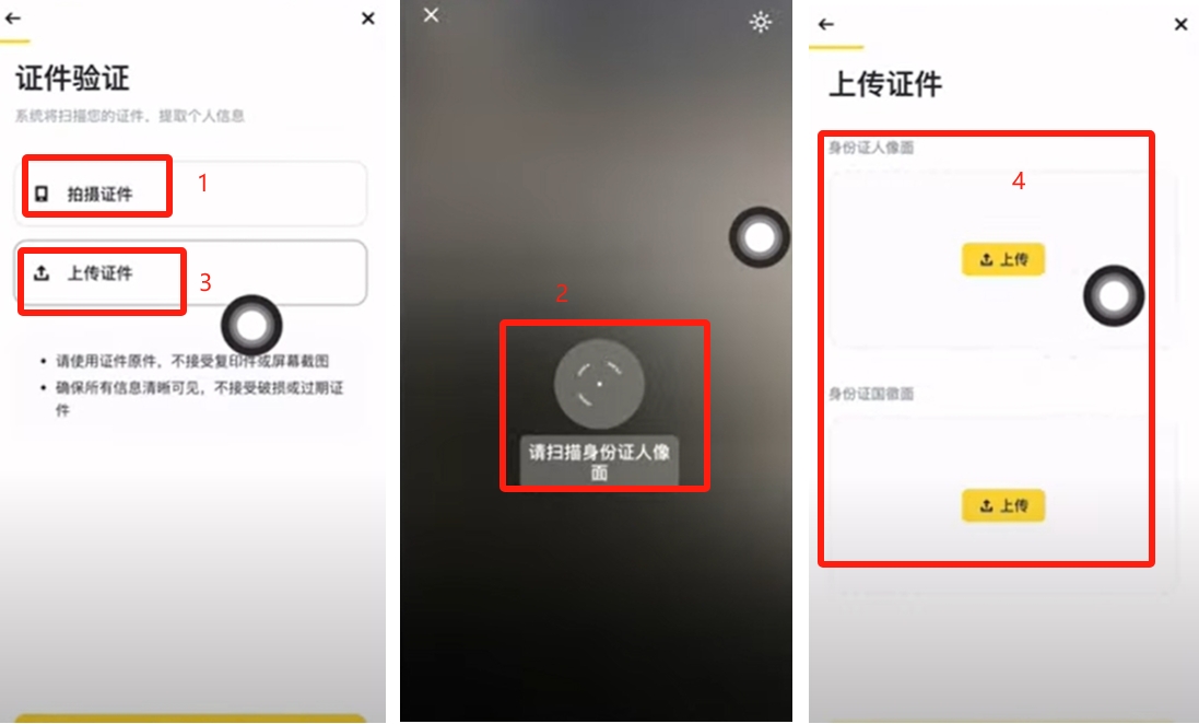 登录APP后进入认证界面,选择中国作为居住地和证件签发国。推荐使用身份 证完成验证,支持直接拍摄或上传证件照片。