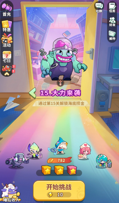 全新副本玩法“海底捞金”同步实装,玩家通关主线第15关后解锁。该玩法设有时间限制,需在限定周期内击败章鱼首领以获得通关宝箱奖励,并逐步开放更高难度层级;挑战失败不消耗体力,每日享有固定次数的免费重试机会。