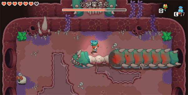 2.该阶段 沙伊霍洛克 会以诡异的姿势卡在内壁上。用零食吸引羊攻击巨虫的屁股,就能解除其无敌状态,对造成有效杀伤。注意躲避天上掉落的巨石,巨虫的酸液,还有被召唤来的史莱姆。