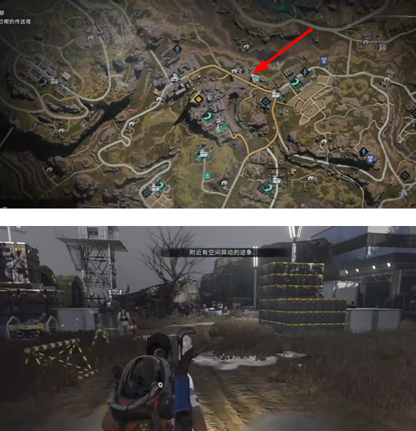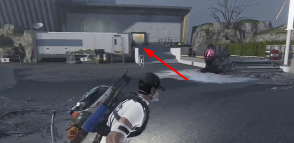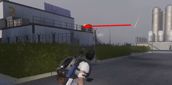 2、走到下图位置后,在左侧会有一个厂房建筑,玩家要顺着建筑的楼梯来到房顶位置,这里会有宝箱;