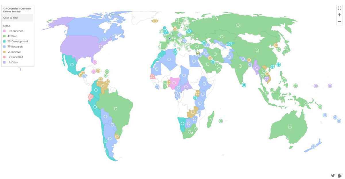 三个国家已推出CBDC,105个国家正在开发、研究或试点阶段。来源: Atlantic Council