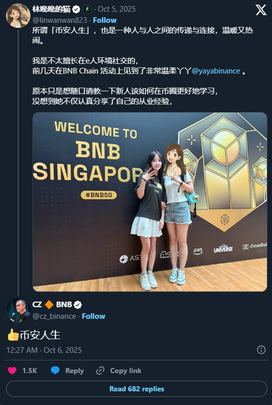 币安联合创办人暨首席客服官何一,是这场现象的起点。10 月 4 日代币发行三小时后,她在 X(原 T@witter)上回复一则社群贴文,写下「祝你持有BNB开币安汽车,住币安小区,享币安人生」。她同时将这情况比作狗狗币(Dogecoin)因打赏文化而爆红的历程,显示她对迷因币的病毒式传播特性有深刻理解。