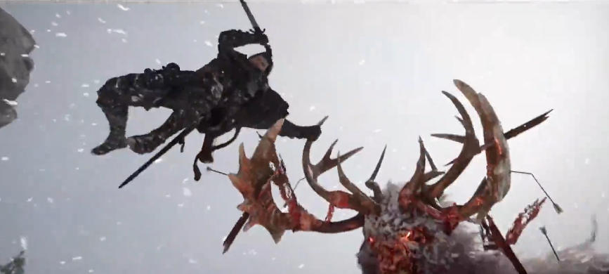 而在今日在《赤血沙漠》战斗影片中亮相、传说中突破暴风雪而诞生的「白色山脉」之主「白角」便是本次公开试玩可挑战的 4 种头目之一,除了拥有庞大身躯、能对玩家进行压制与大范围攻击外,还可使用如划破暴风雪后突进并发动攻击等多样而勐烈的战斗机制。