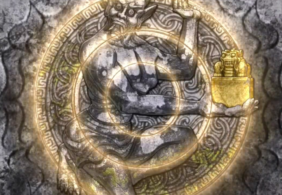 成功复原后,对应侍女石像自动转向,胸口铜镜反射出一道清晰光束。此时可前往下一尊石像——第二尊手持金色法杖的夜叉形象,同样采用三层石环旋转方式复原图像。解谜完成后,该侍女亦同步转向,光路进一步延伸。