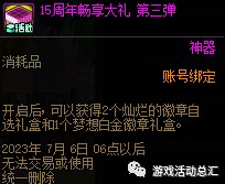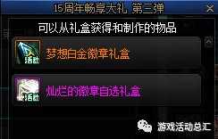 11周年与12周年送的是[本职业随机白金徽章礼盒],13周年送的是2个[灿烂徽章自选礼盒],14周年庆与15周年送的是2个[灿烂徽章自选礼盒]+1个[梦想白金徽章礼盒]。