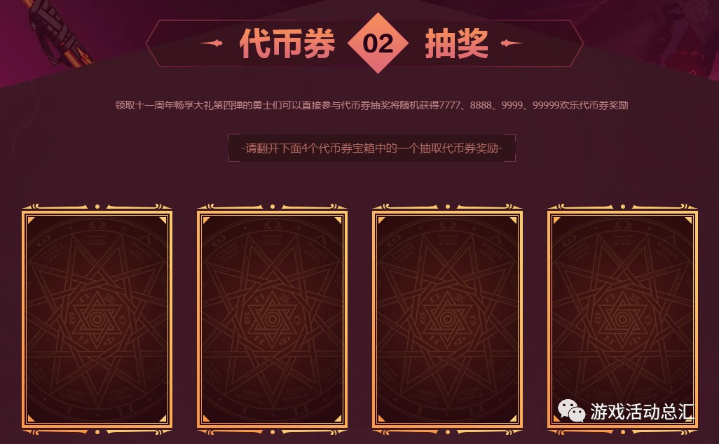 7~8周年是固定获得7000欢乐代币券;9周年开始正式开启代币券随机送时代,保底可得7000欢乐代币券,最高可得99999欢乐代币券;10~15周年庆则是将保底提高至7777欢乐代币券,最高可得依旧是99999欢乐代币券。
