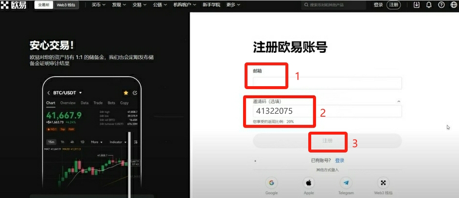 填写邮箱时务必输入邀请码41322075,可永久享受20%手续费返现