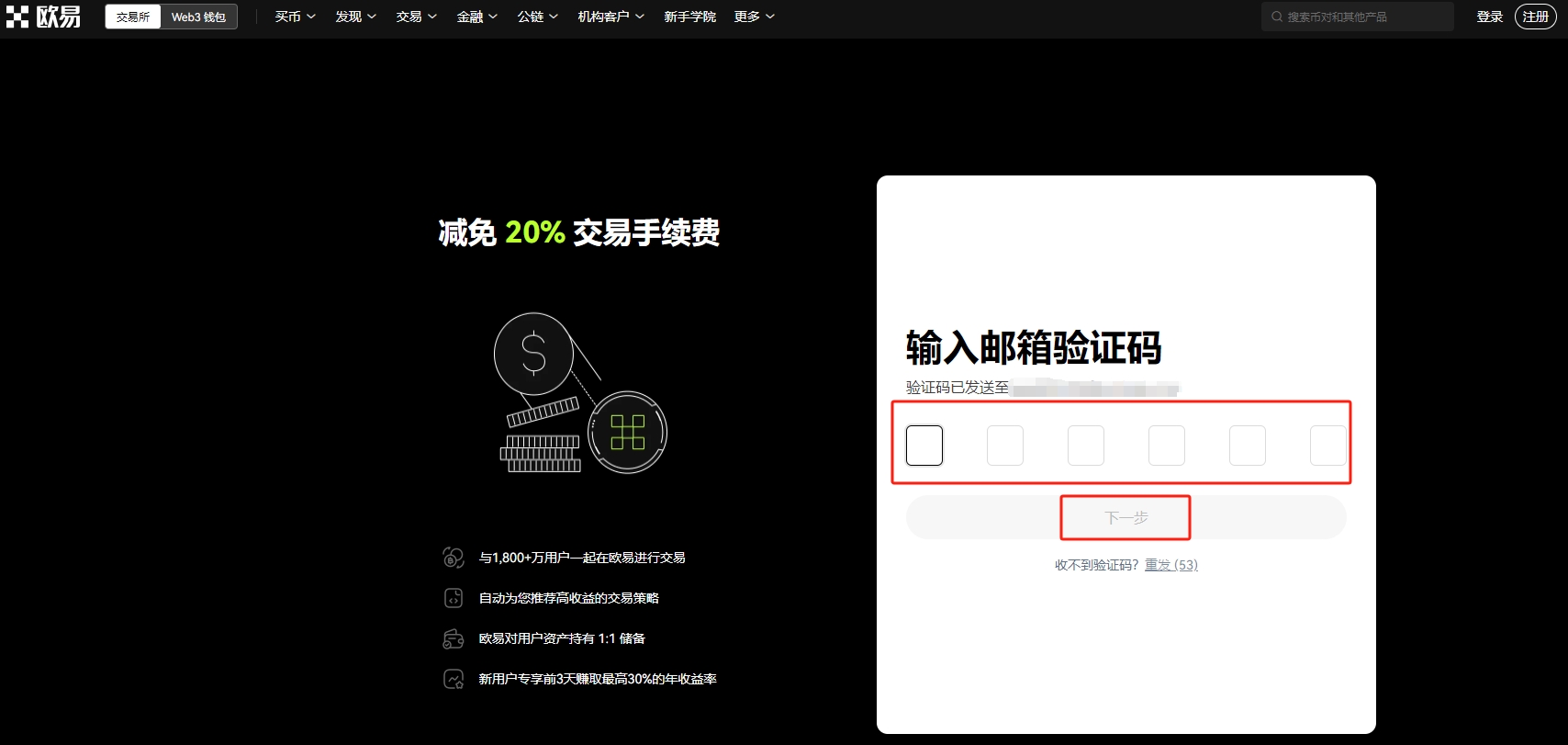 第一步需填写有效邮箱地址(支持163/QQ/Gmail等),建议使用专属邀请码8798090获取永久手续费优惠,确认无误后点击注册按钮。