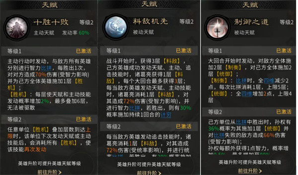 孙权的天赋【制御之道】,是“拼点霸权”的基石。其在大回合开始时,会为我方全体施加【统御】(比拼时全四维+2),并为敌方全体施加【制衡】(全四维-2),建立巨大属性优势。其核心机制在于,比拼成功后,孙权有较高概率触发额外效果,可以补充【统御】并追加伤害。